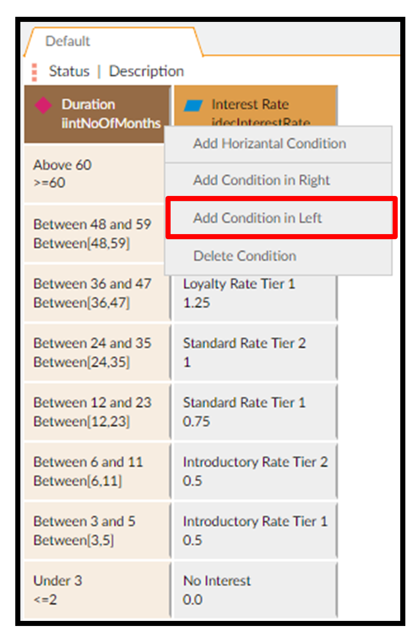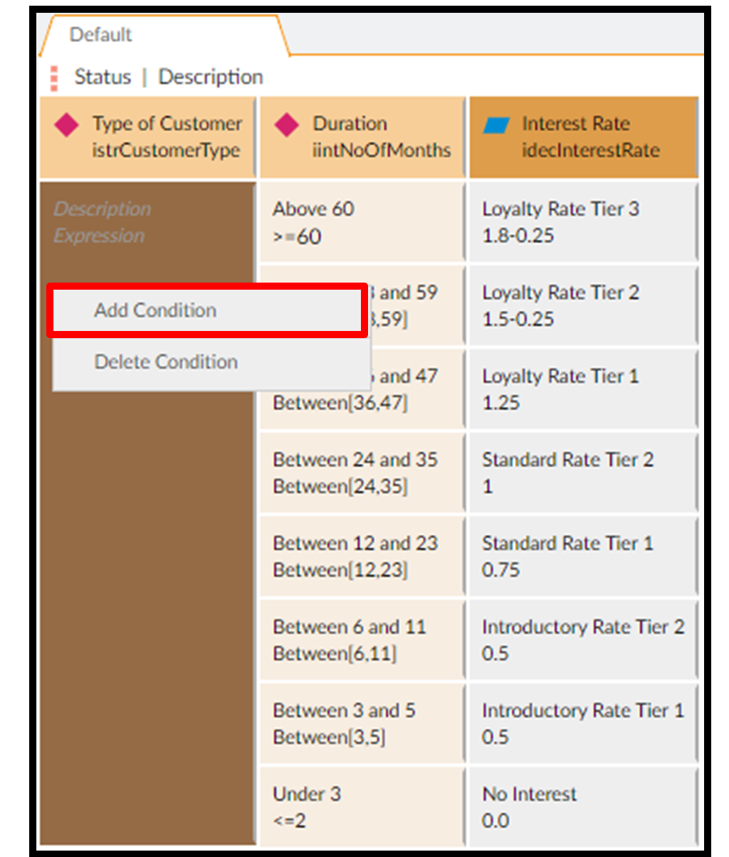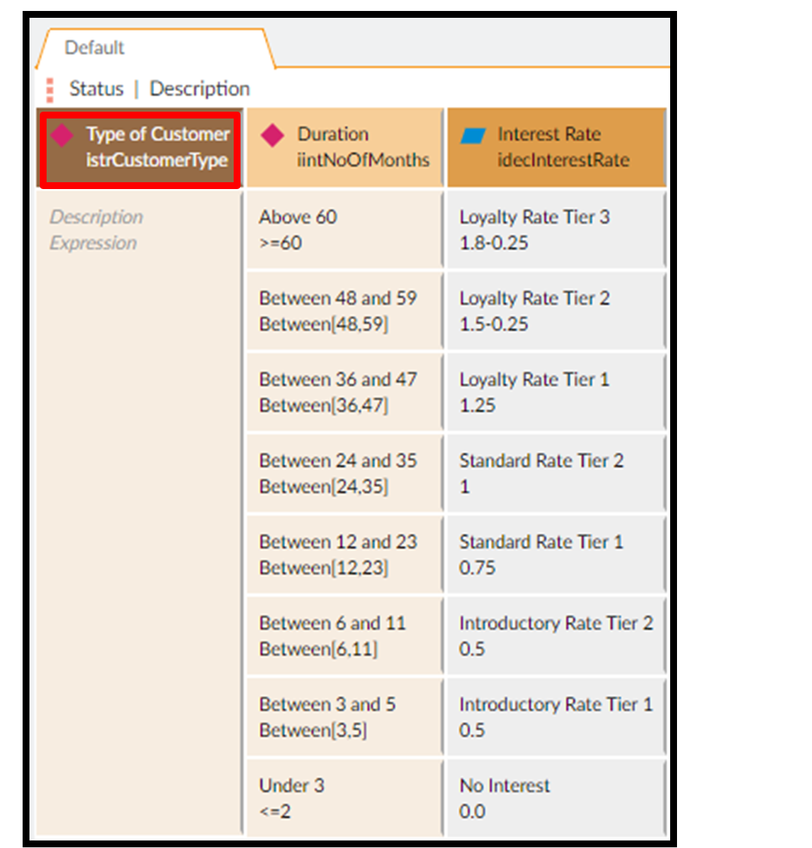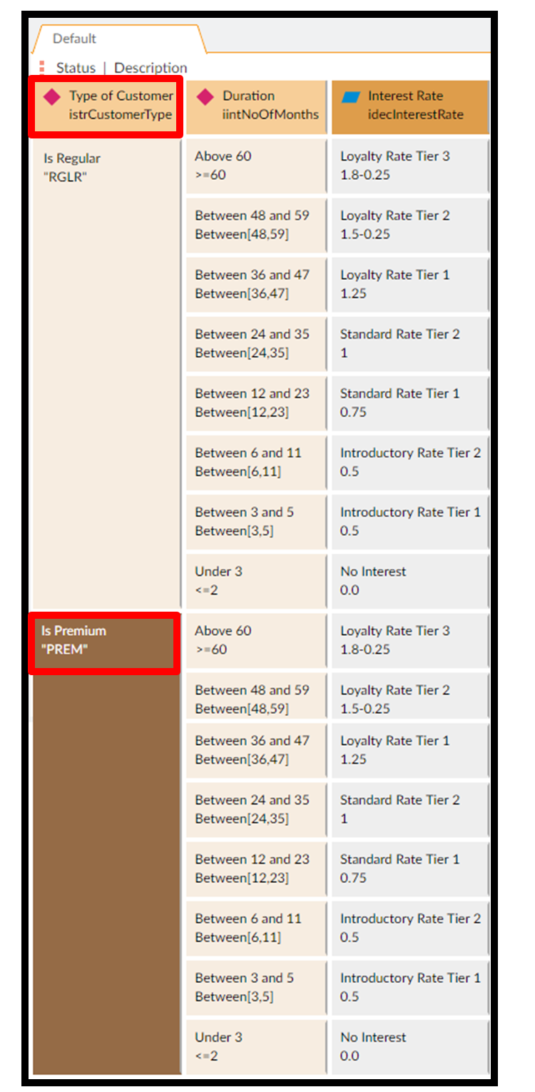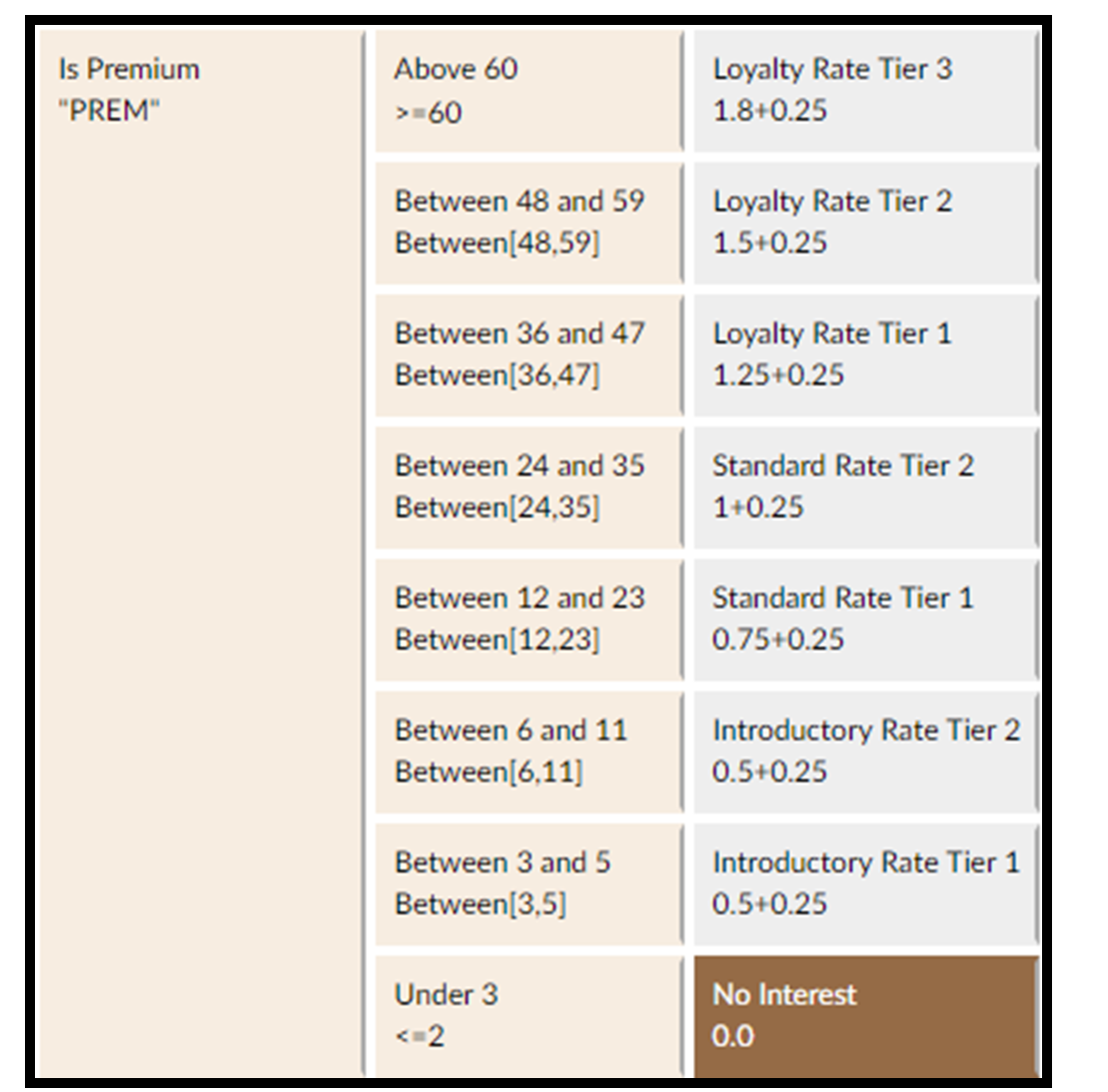 Currently, this rule only uses the number of months to determine the interest rate. This example adds another factor to affect the rate: whether the account holder is regular or premium.