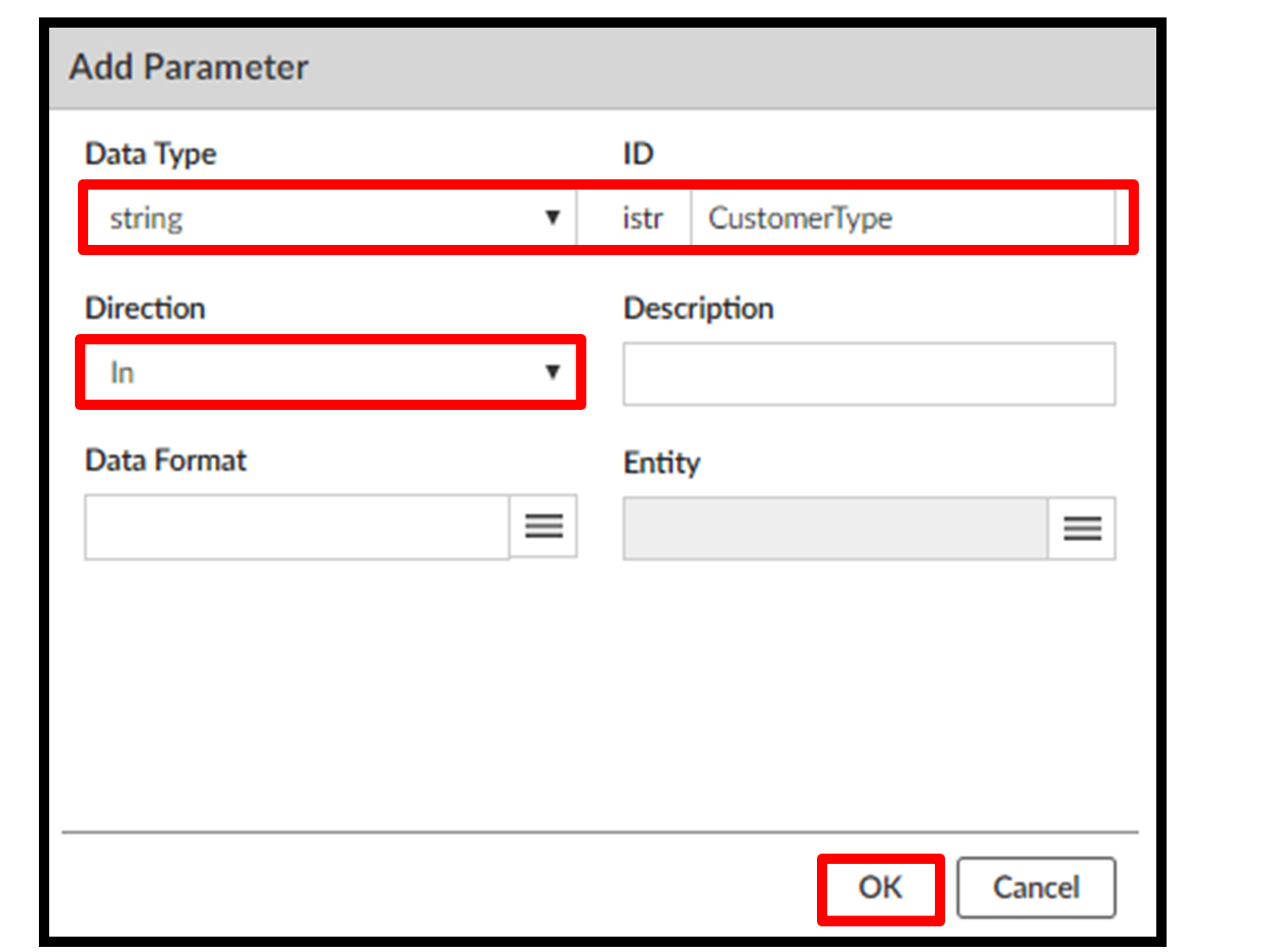 This variable is going to be called “CustomerType”. The Direction is In and the Data Type is string.