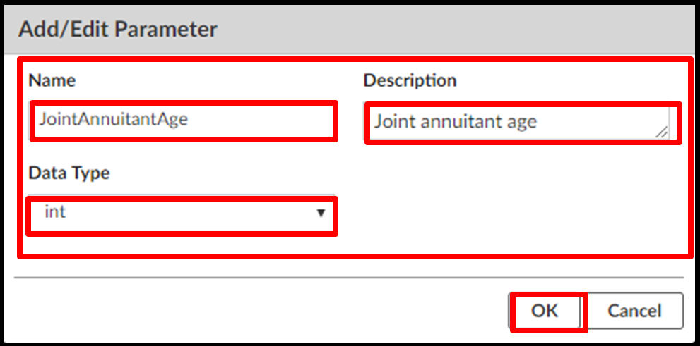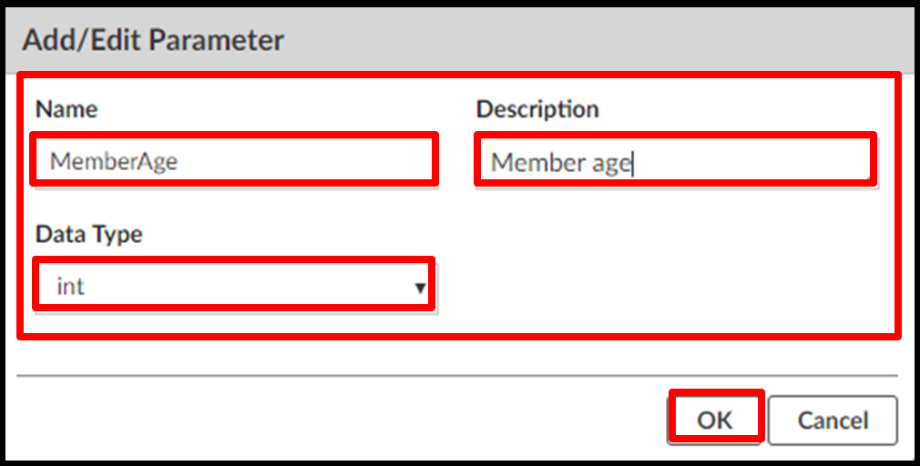 This example uses the age of the member. You must enter a name for the parameter, as well as its data type. Optionally, you can enter a description.