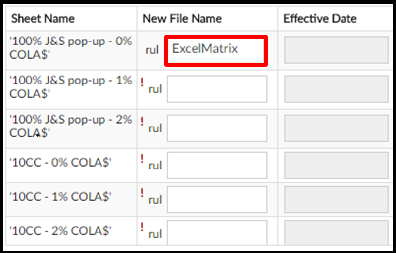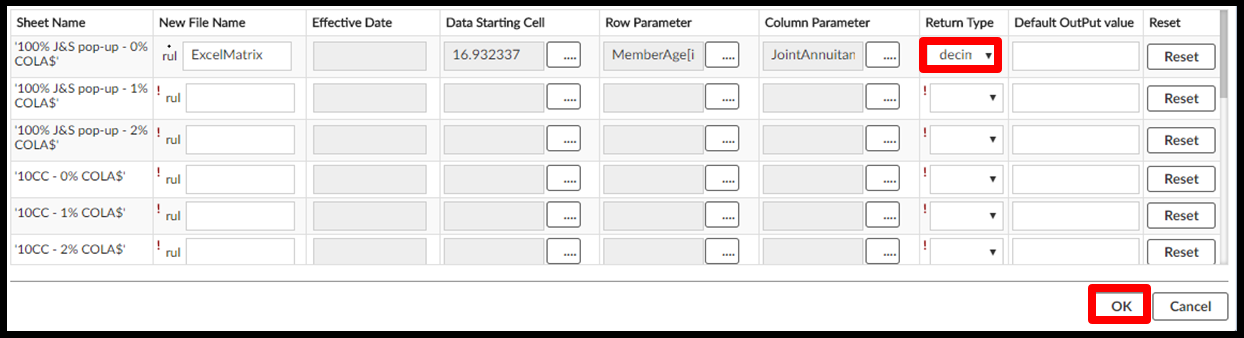 This example uses the joint annuitant age as a column parameter. This parameter has all the same properties as the Row Parameter.