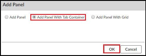 S3 displays the Add Panel popup. Select Add Panel With Tab Container.
