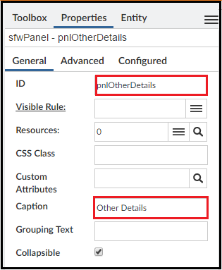 Open the panel’s Properties tab on the Left Panel. This enables you to edit custom properties for the panel.