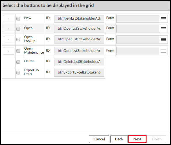 These are the buttons you want the user to have on the grid to manipulate it. Usually you skip this step and configure buttons later.