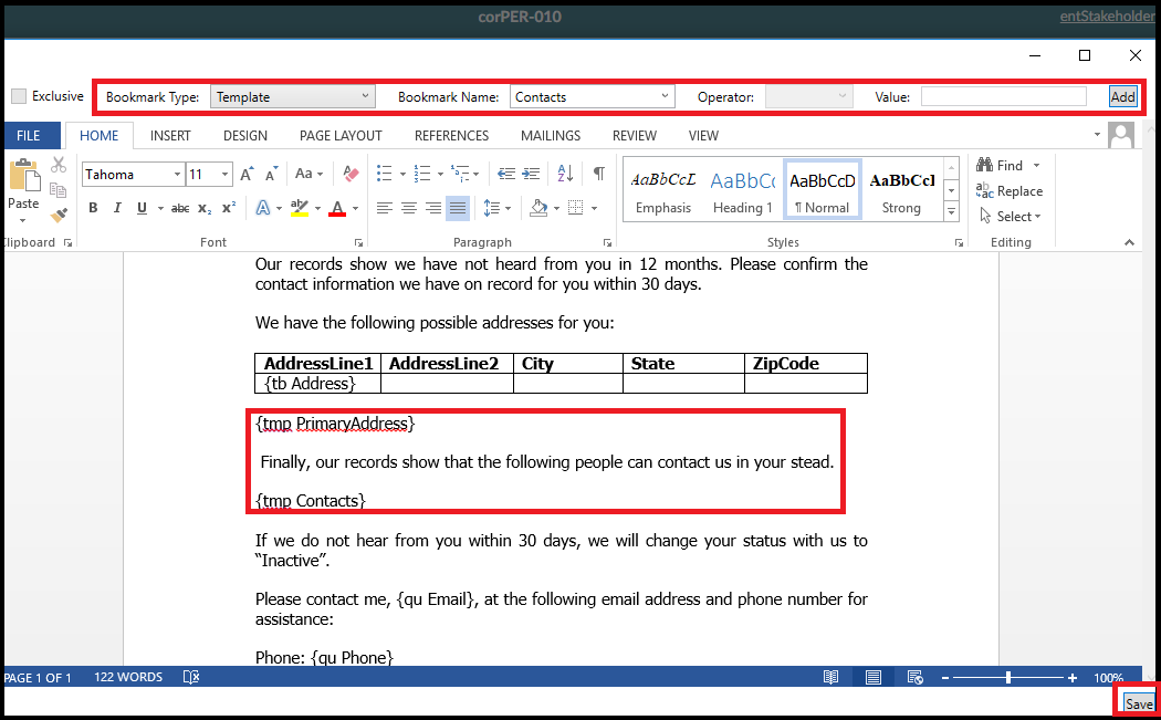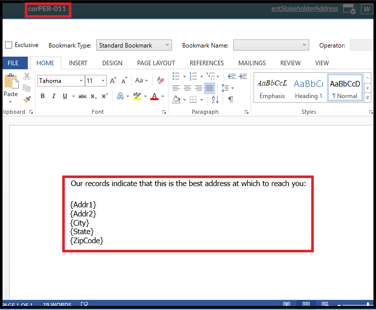 In this example, PrimaryAddress is an entity-based bookmark. It will only print one entity. In this case, it will print the primary address.